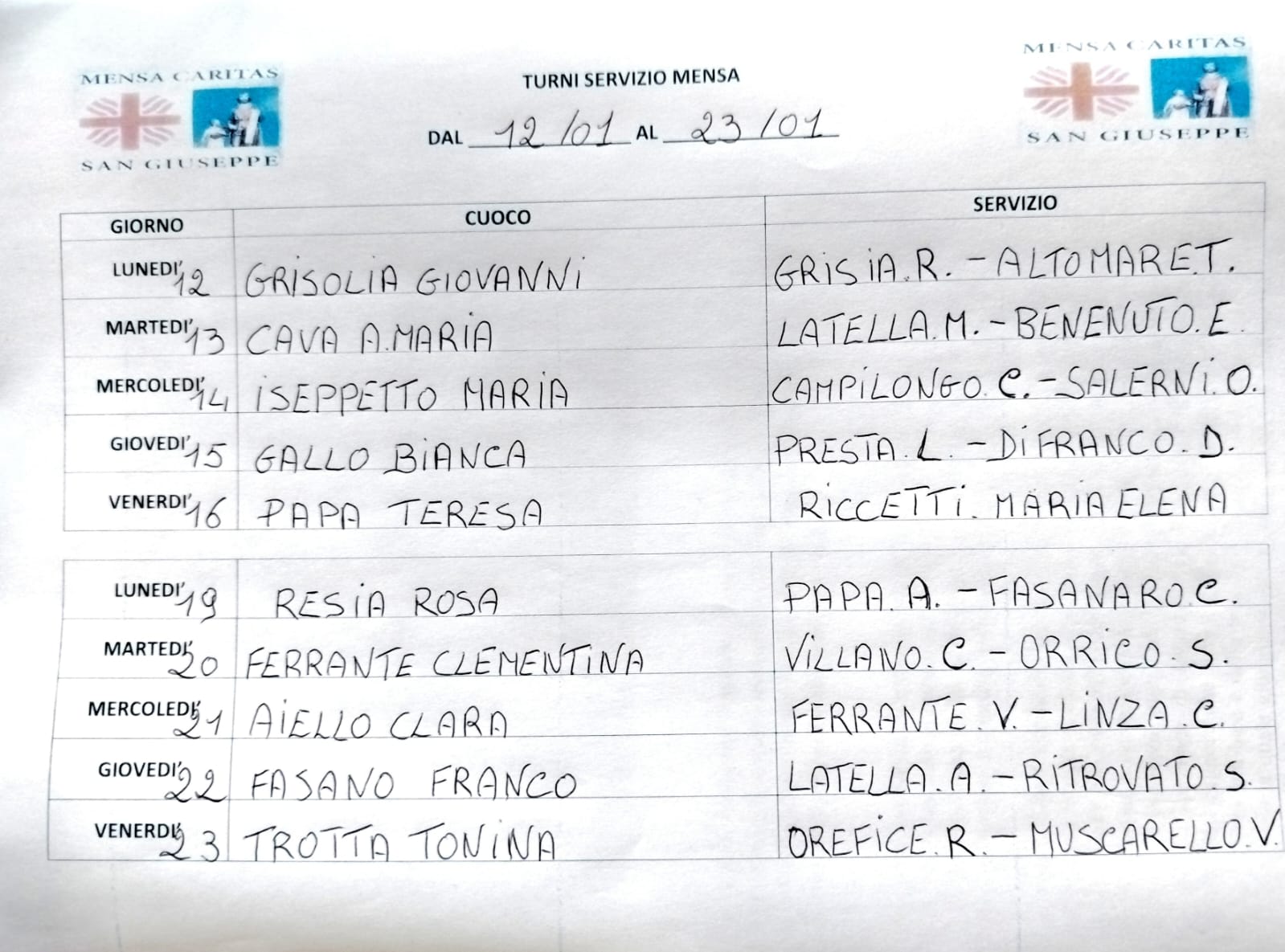 TURNI SERVIZIO ALLA MENSA DAL 21 NOVEMBRE AL 02 Dicembre 2022 |